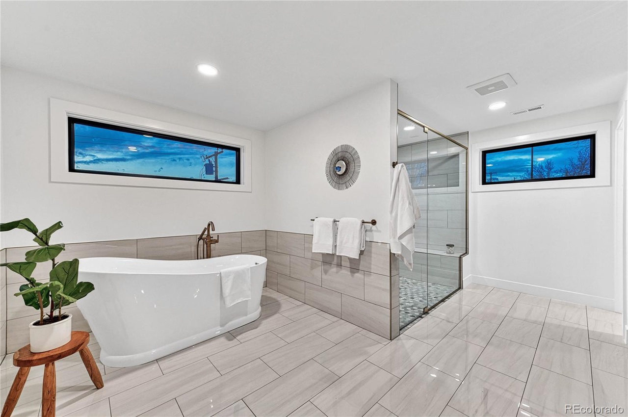 The primary suite has floor to ceiling windows with mountain views. The stunning primary bathroom has a stand-alone bathtub and zero threshold shower, double vanity with amazing tile and brass mirrors and beautiful tile floors. 2 huge walk-in closets with access to the laundry room. 2 additional en-suite bedrooms on the 2nd floor, with custom tile floors and showers. 3rd floor loft includes a 3/4-bathroom, bar area, accordion sliding glass doors opening to a covered roof top deck which show off the mountain views.