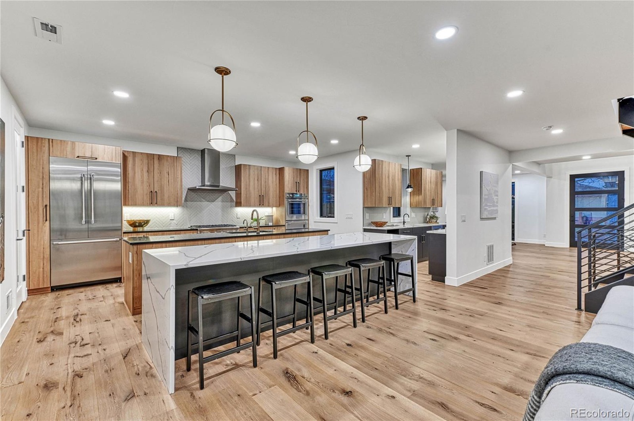 3 story modern home 1 block north of Sloan’s Lake. The home’s front brick exterior and black windows welcome you into this stunning home. Expansive ceilings, Light and bright, open floor plan with beautiful large windows, Luxury finishes. Gourmet kitchen with a double island, 6 burner gas stove-top, double oven, Thermador refrigerator and butler’s pantry. Formal dining, office/flex space, Great room with gas fireplace, double slider to the back patio.