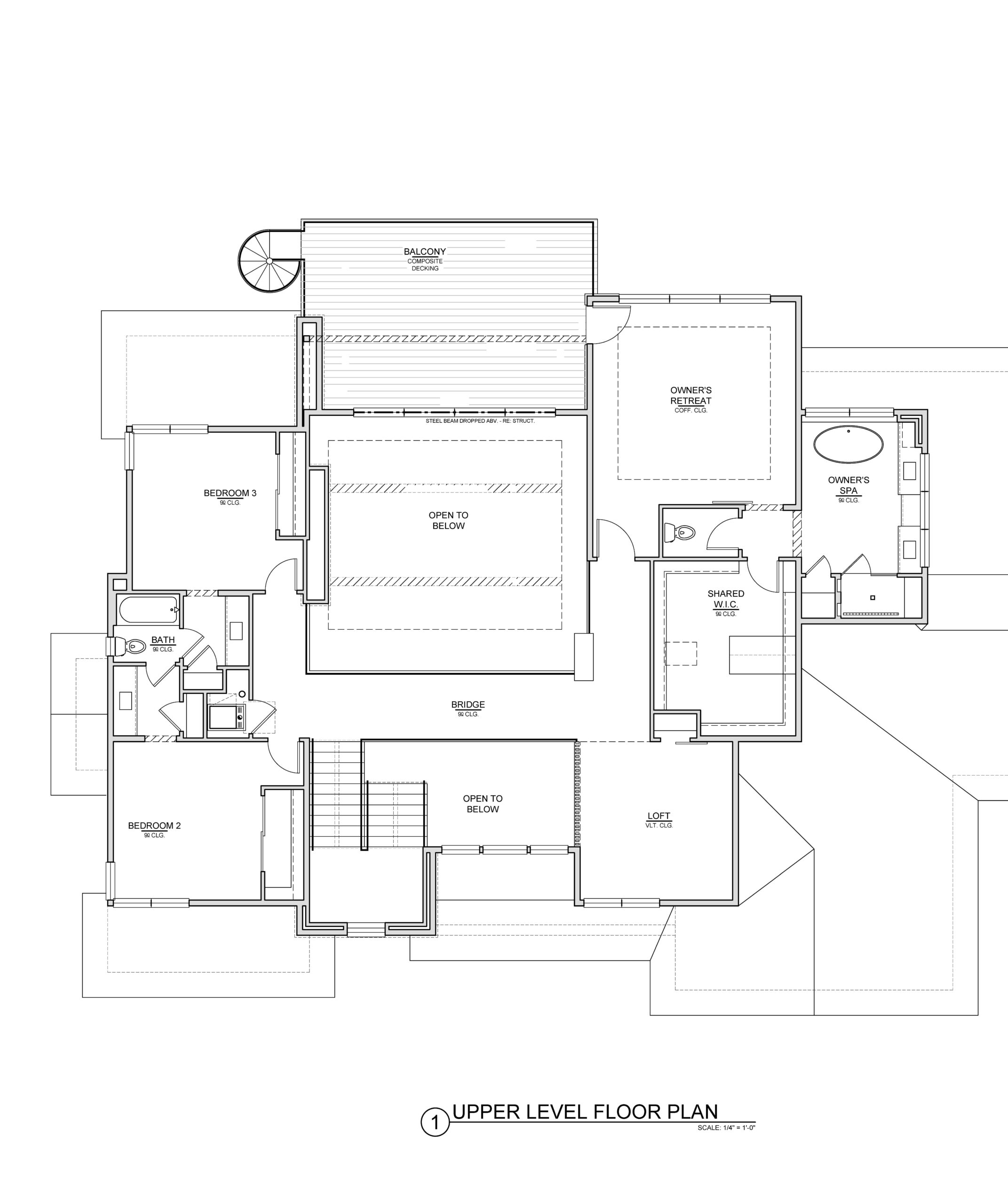 An ascent up open steel mono stringer to the second level will land to two full ensuite bedrooms and then across the bridge to a lofted study area and on to the owners retreat.  A second level deck can be accessed from the owner’s suite; and also from the ground via a circular steel staircase outside.  The large great room will feature grand volumes and connection to the entertaining spaces on the main level as well as stairs to the lower walk out level.  The lower level will feature two more bedrooms, a shared bath, adn los fo room for family, entertaining, and games.