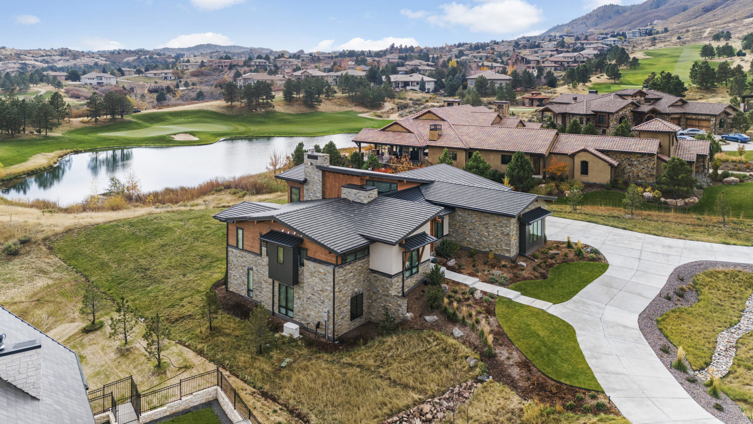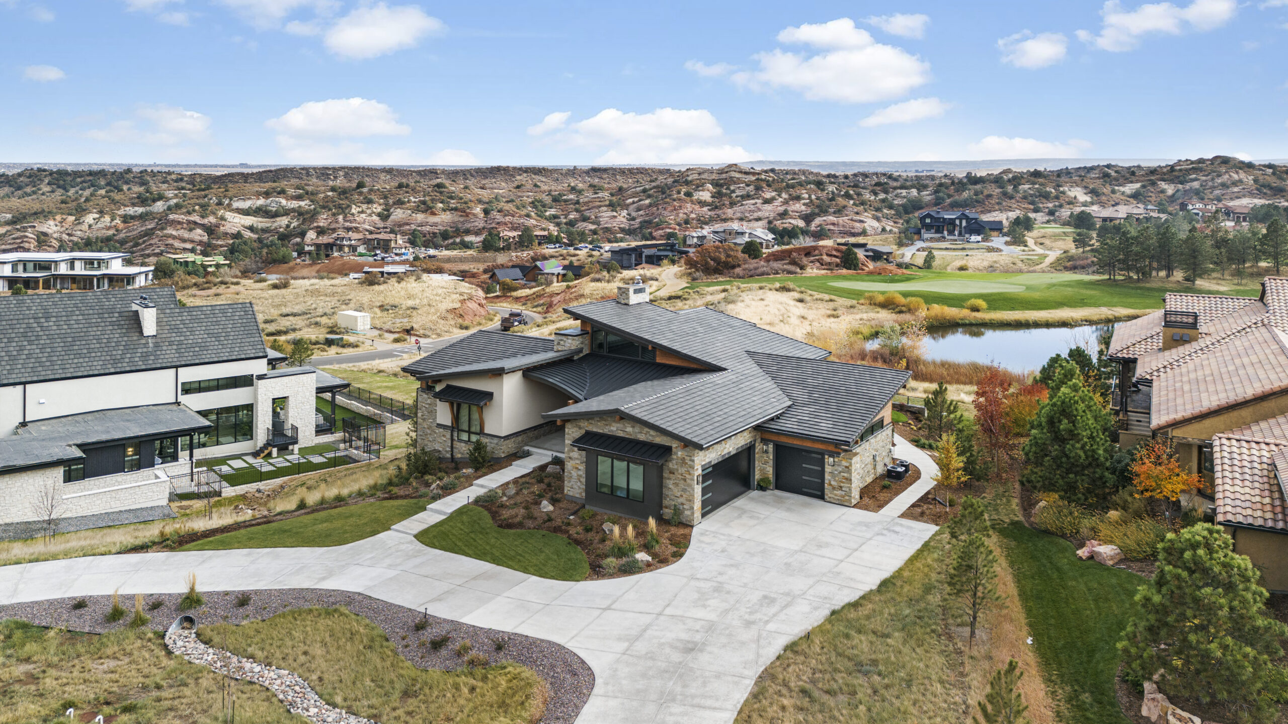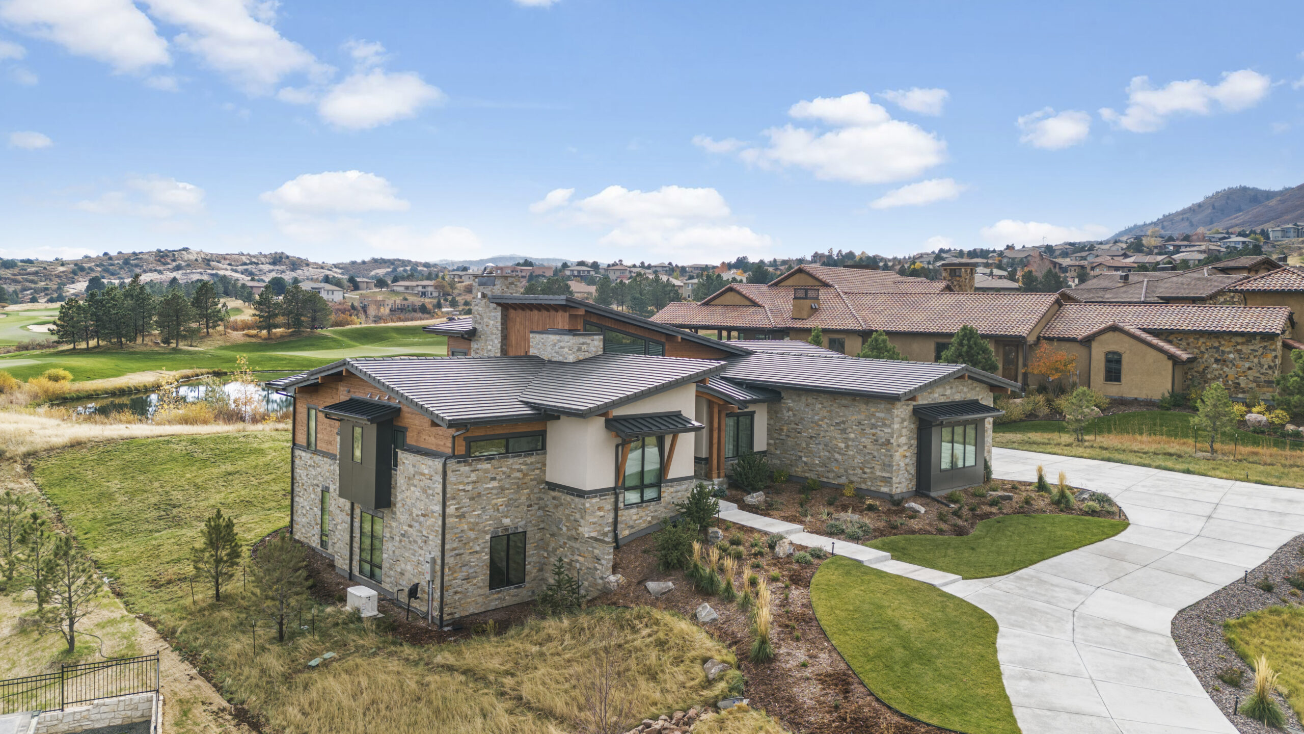 Nestled between Ravenna golf course and Pike National Forest, this custom one-story home was built for enjoying the great Colorado outdoors. Its modern wood, stone, and stucco exterior is eye-catching, yet blends in with its beautiful natural surroundings. Abundant windows on the main level invite the outdoors in, filling the owner’s retreat, great room, and kitchen with natural light. The walk-out finished basement features a wine room, exercise room, and game room, and opens to an expansive outdoor living area anchored by a fire pit.