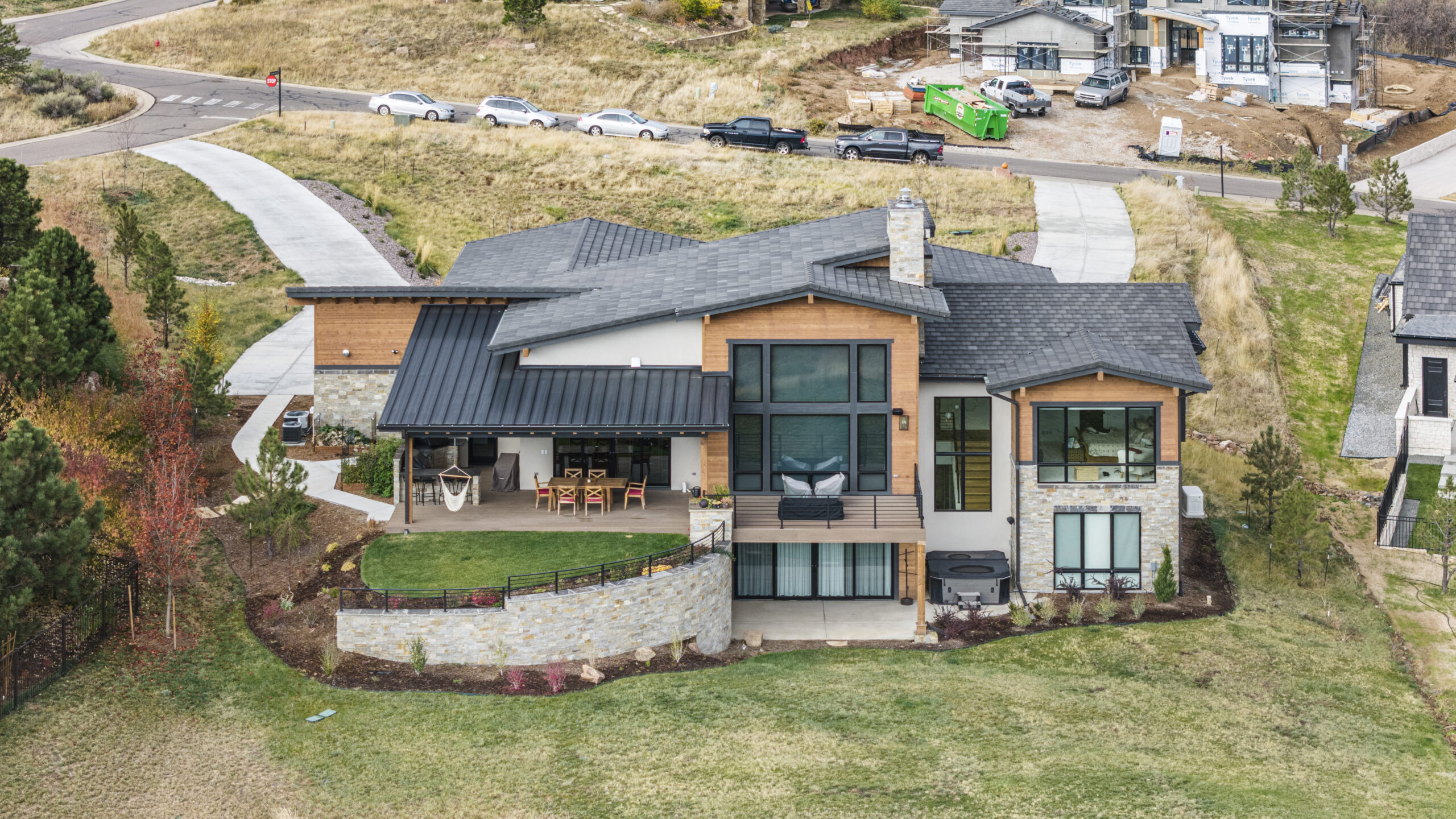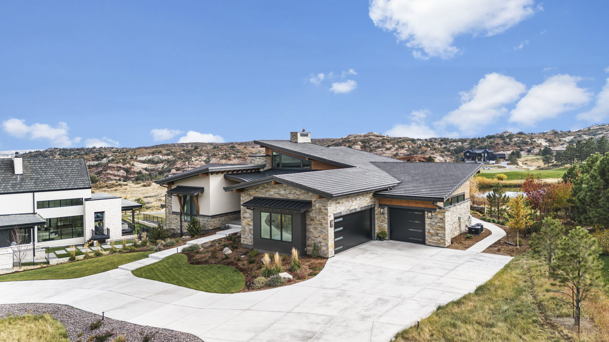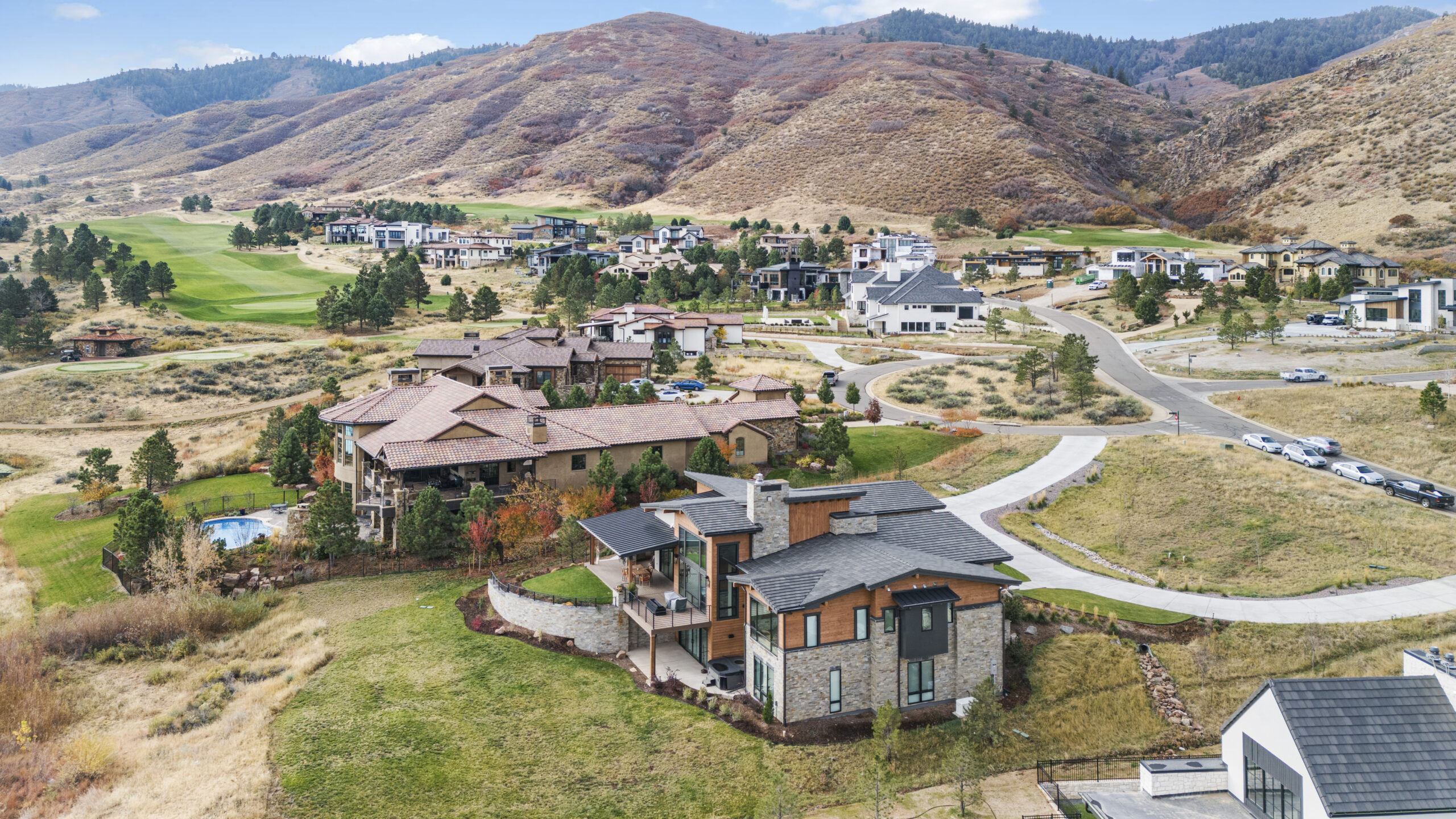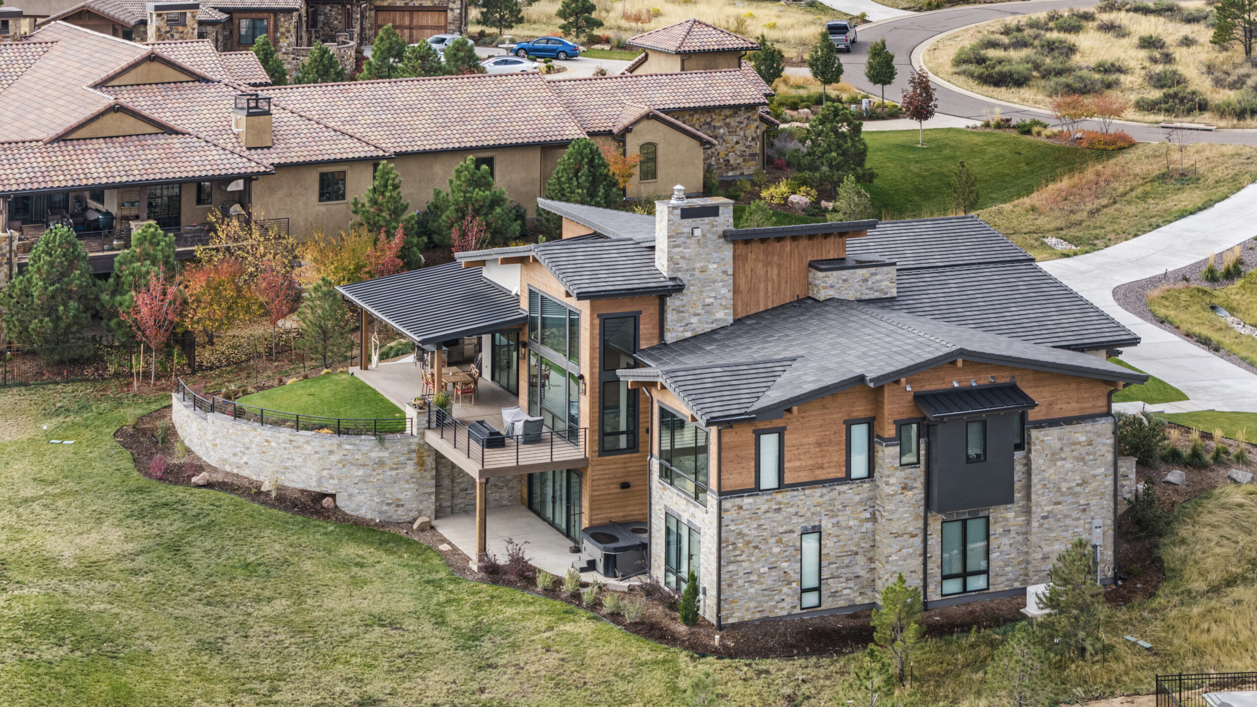 Nestled between Ravenna golf course and Pike National Forest, this custom one-story home was built for enjoying the great Colorado outdoors. Its modern wood, stone, and stucco exterior is eye-catching, yet blends in with its beautiful natural surroundings. Abundant windows on the main level invite the outdoors in, filling the owner’s retreat, great room, and kitchen with natural light. The walk-out finished basement features a wine room, exercise room, and game room, and opens to an expansive outdoor living area anchored by a fire pit.